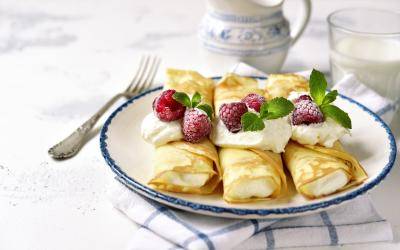 - Palatschinken mithilfe der Folie einrollen und quer Dritteln.