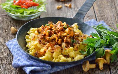 - Zuletzt die Spätzle, Petersilie und den Tirol Milch Tiroler Felsenkeller Käse den Schwammerln unterheben und in der Pfanne servieren.